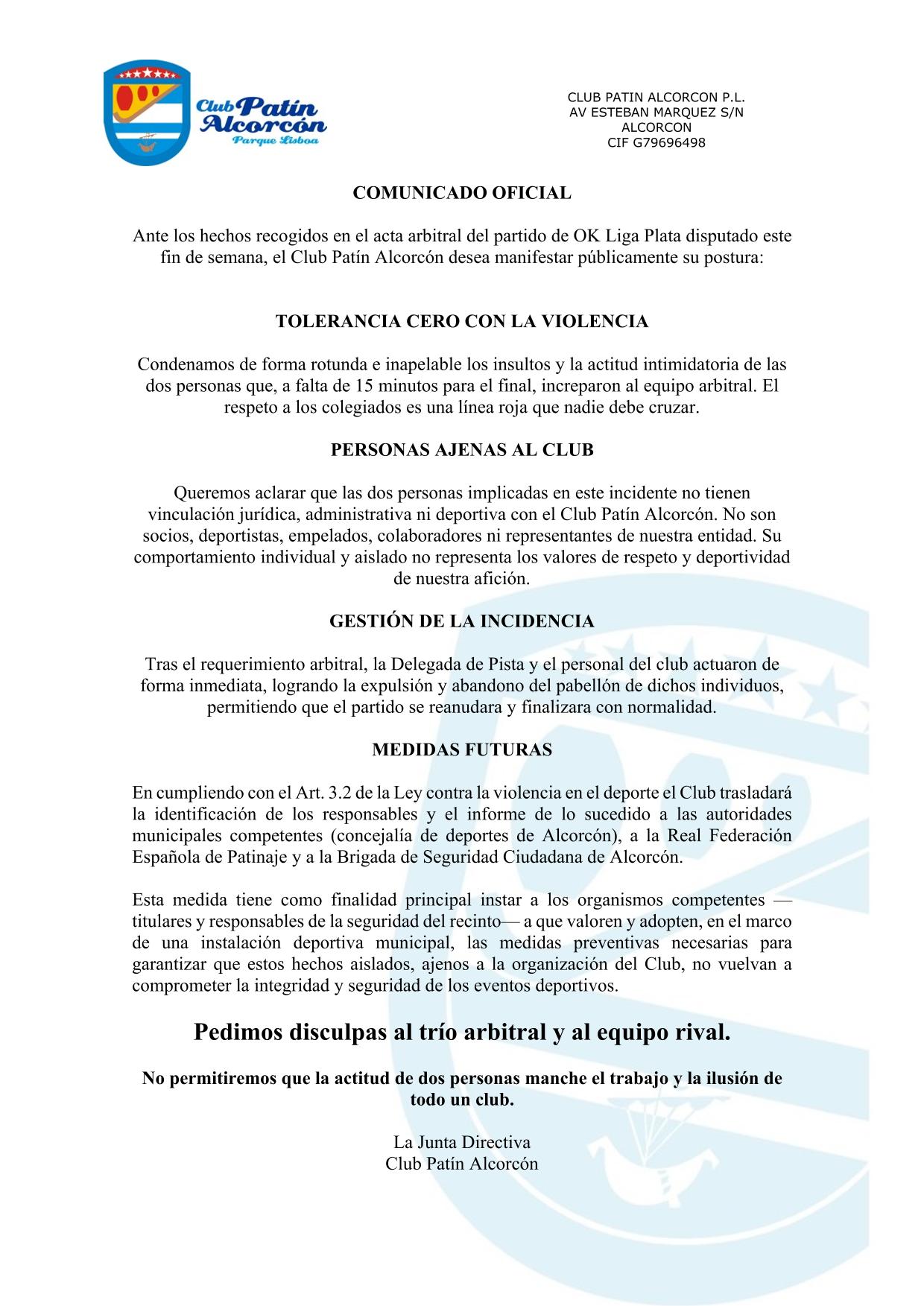 Os compartimos el comunicado oficial y la postura del club ante los hecho ocurridos durante el partido de OK Liga Plata Masculina entre CP Alcorcón y Congres